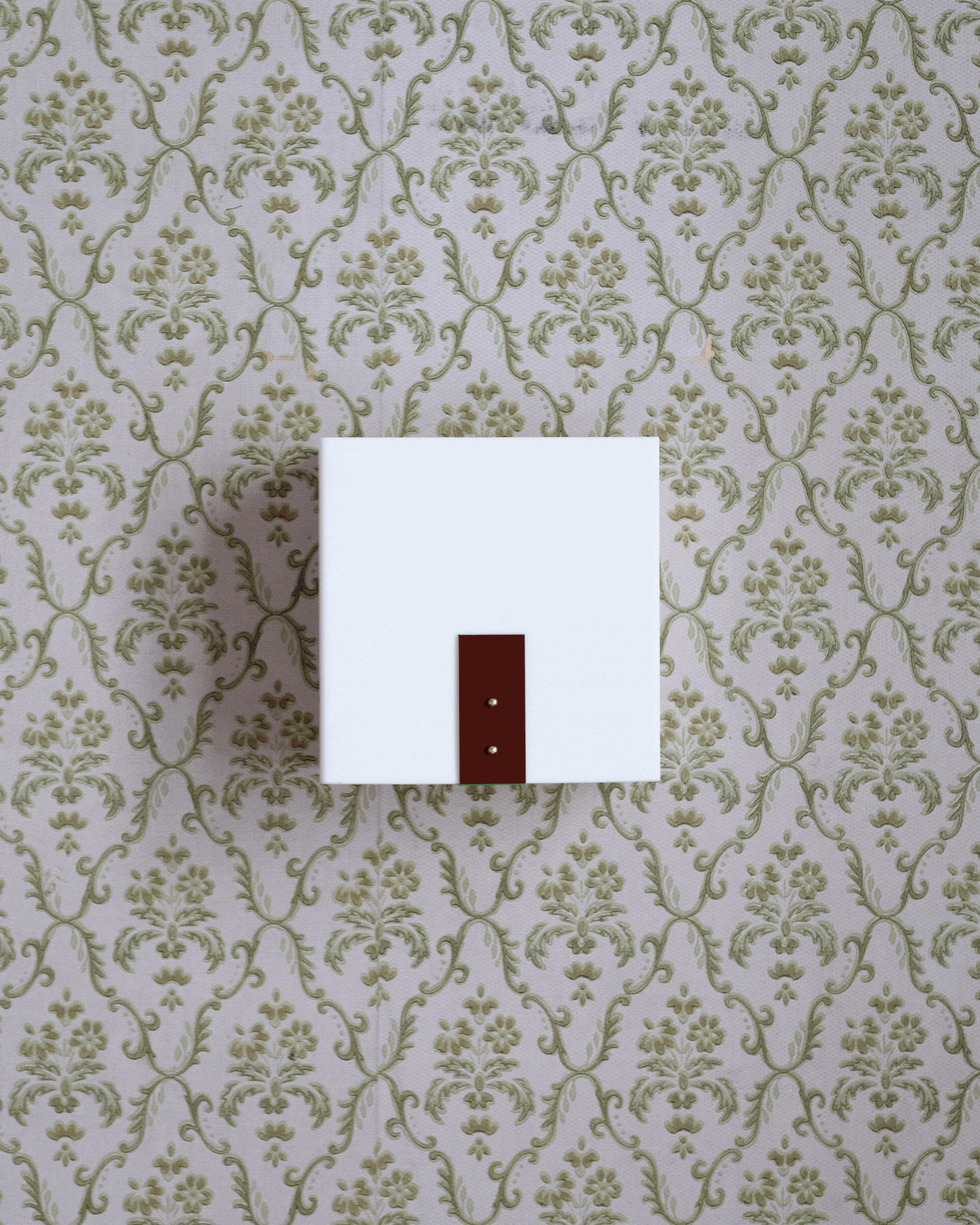En aluminium brut, noir, bordeaux ou vert, un cercle ou un rectangle maintenu par deux vis à tête boule en aluminium ou en laiton occultent la pièce de fixation.